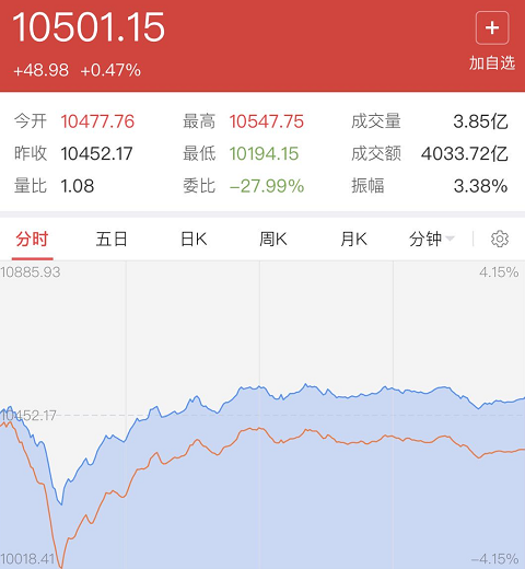 但是,10点之后,市场的走势,彻底让空方傻眼,三大股指急速反弹,截止收盘,除上证指数微跌0.19%之外,深证成指和创业板指均收红,而且是放量的,两市合计成交量超过8000亿。