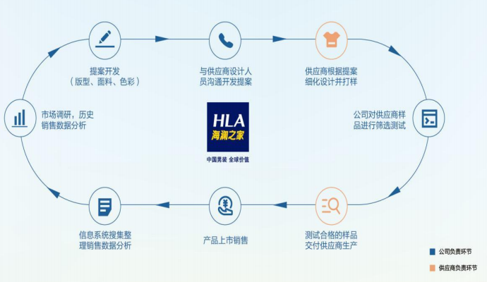 海澜之家与供应商的“联合开发模式”,在业内算得上独树一帜,从投入和产出来看,这种模式的研发效率是很高的。在供应链上游,海澜之家拥有300多家优质供应商,在联合开发模式之下,海澜之家和供应商之间建立了精细化的配套和分工——海澜之家设计中心重在通过大数据把握产品企划与宏观设计,供应商的设计师则重在产品细节设计与创意,再经过筛选、修改确定新产品款式。最后,供应商拿到订单进行生产,产品交给海澜之家销售。