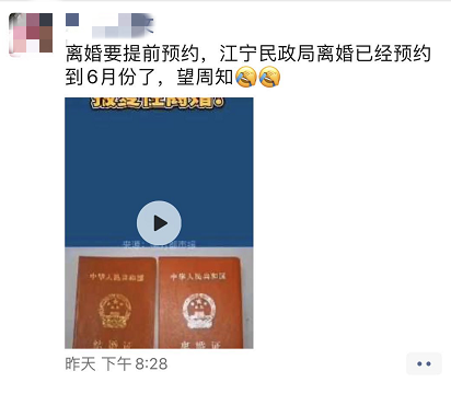 而南京呢,据说,仅江宁区的离婚预约,已经排到6月份了,离婚离得民政局忙不过来了。
