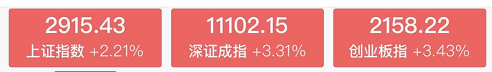 今天,沪深两市,高开高走,牛气冲天,截止收盘,上证指数涨2.21%、深证成指涨3.31%、创业板指涨3.43%,两市132家个股涨停,涨幅超过5%的,也有近500家。
