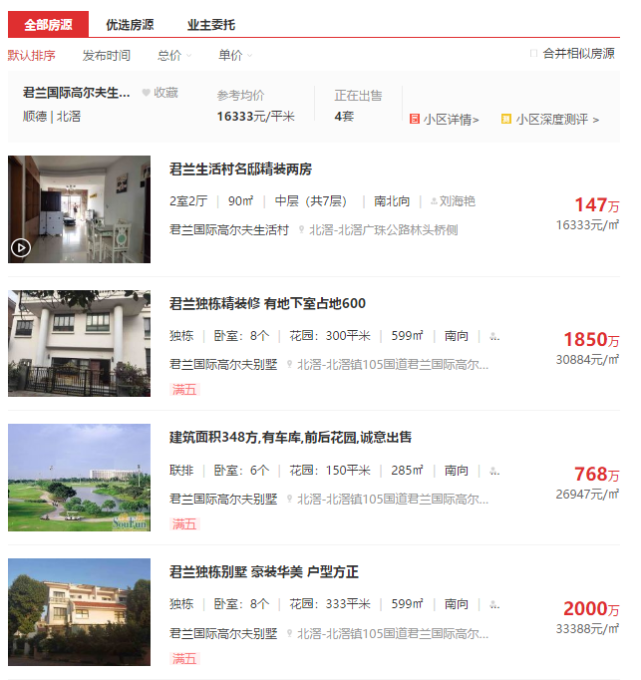 君兰国际高尔夫生活村,这个小区,我查了一下,目前平层在1.5万/平米左右,别墅价格,大抵在2万-3.5万/平米之间,总价高一些的,有一两千万,低一些的,仅五六百万。