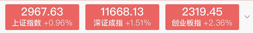 今天,A股三大指数,一路全部低开高走,截止收盘,分别上涨了0.96%、1.51%和2.36%。