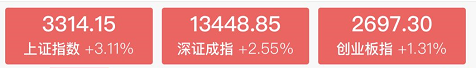 再然后,今天,A股又来了一记旱地拔葱,上证指数单日暴涨3.11%,深证成指涨2.55%,创业板指涨1.31%。