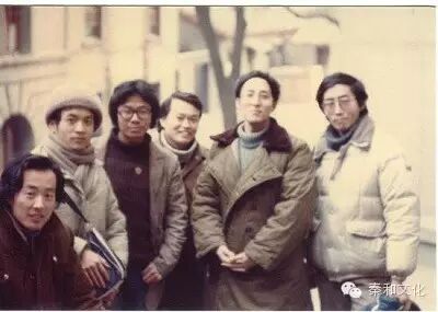 左起:杨炼,顾城。右起:北岛,钟文,唐晓渡 1985年北京