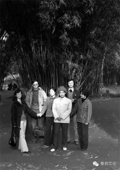 1986年12月,顾城(左四)、谢烨(左三)与舒婷(左一)、北岛(左二)等人,到成都参加星星诗歌节,并同游望江公园。(肖全摄影)
