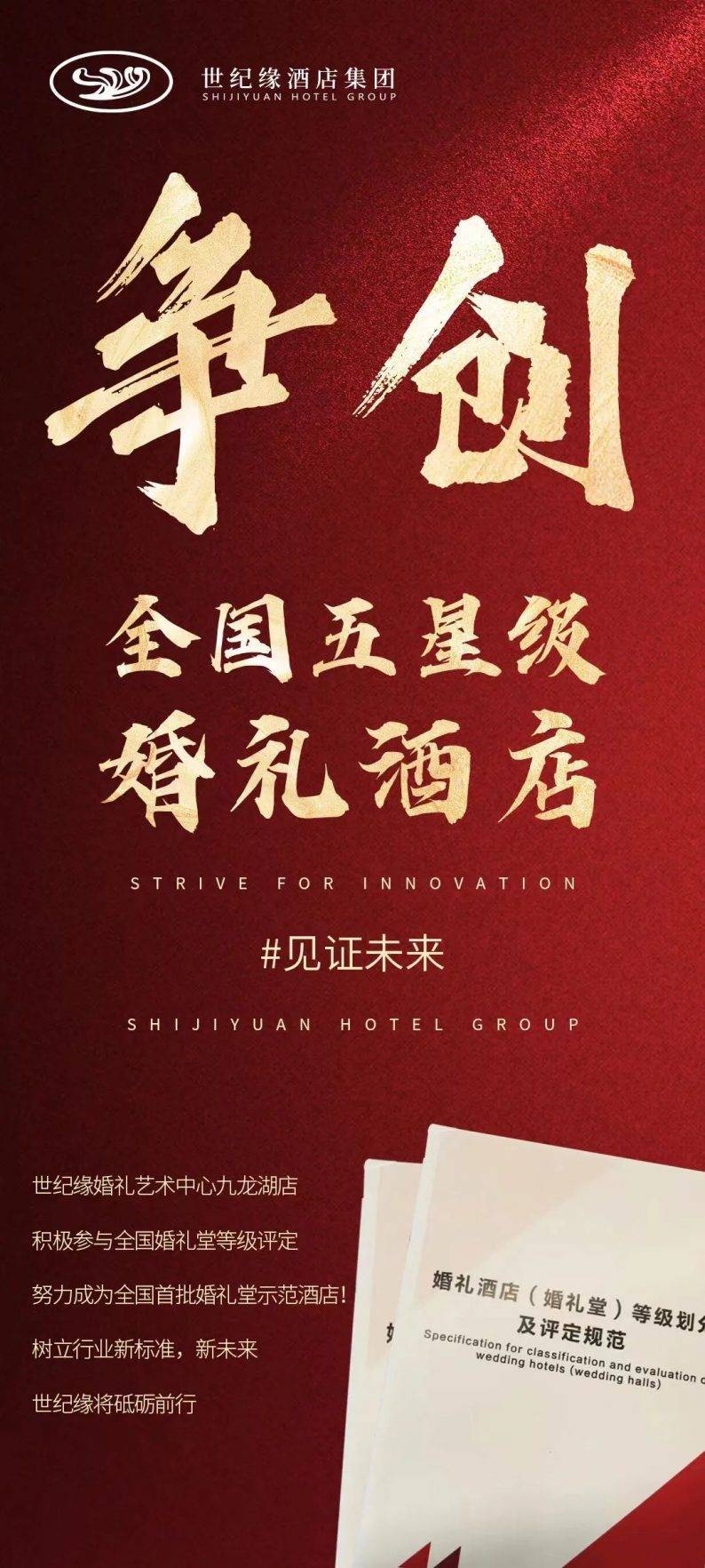 8月26日,世纪缘婚礼艺术中心九龙湖店正式成立申报小组,积极参与全国婚礼堂等级评定,争创全国五星婚礼酒店。这是继全国婚礼酒店(婚礼堂)等级评定工作正式启动后的,第一家申报酒店。