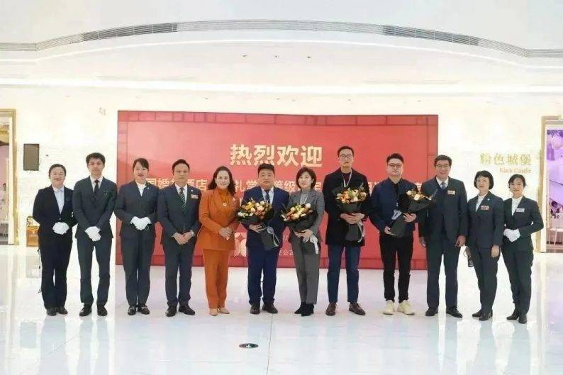 公司董事长封雅林女士亲自带领公司总经理林小成先生、副总经理张梦春女士、副总经理陈荣华先生、董事长助理邓艳华女士、公司各部门负责人及铂晶盛宴各级管理层为全国婚礼酒店(婚礼堂)等级评定工作小组举行隆重的欢迎仪式。