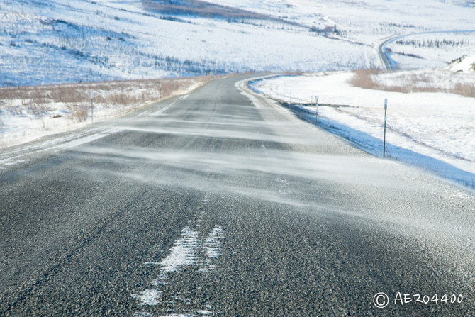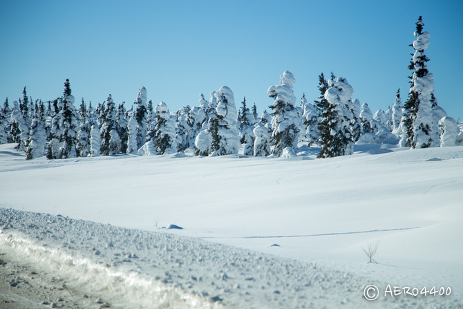 越往北开,路两侧积雪越多,刮风的时候路面会有雪层飘过,这里要注意行车速度。