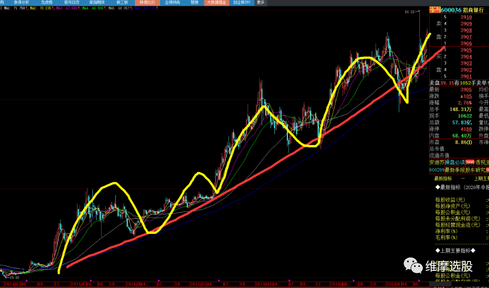 下图长线案例:招商银行600036。最近五年沿着45度角波动。