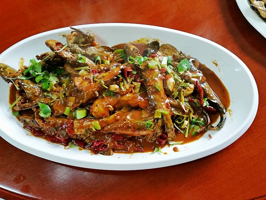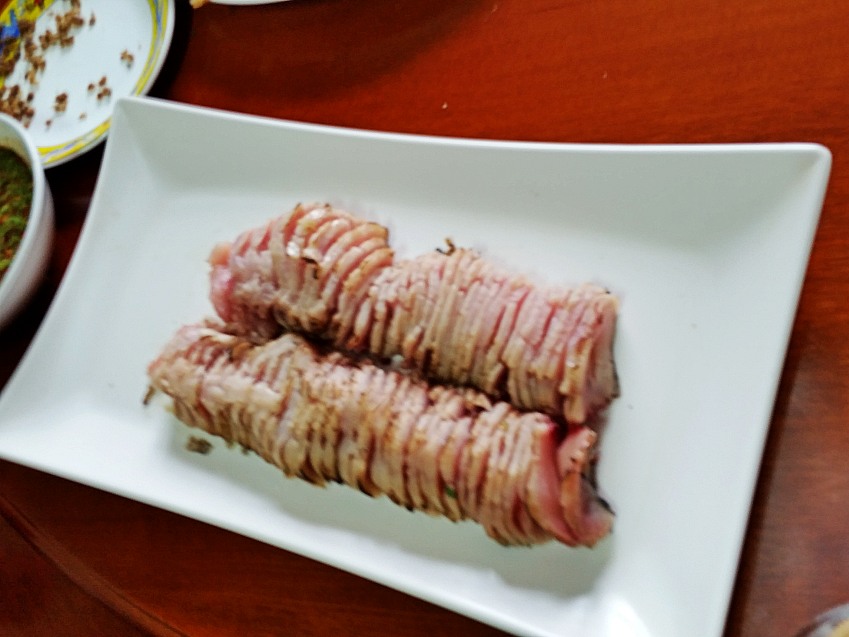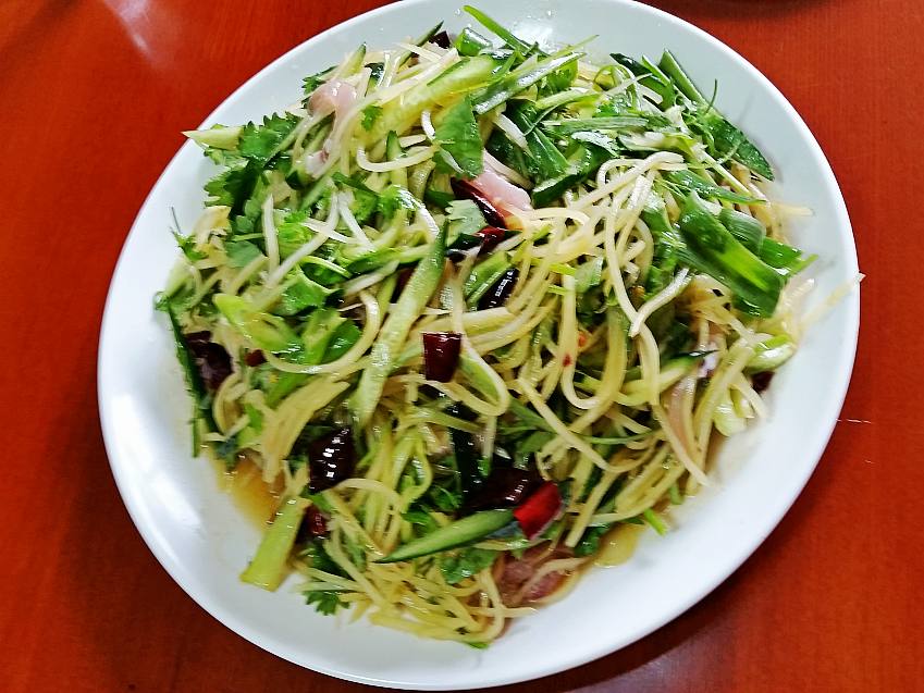 【烤塔拉哈】塔拉哈是赫哲语,意思是烤生鱼。这道鱼是赫哲族人的地道吃法,鲤鱼切成鱼片,用火烤制五成熟以下,然后蘸调味料吃,应该很鲜嫩的口感,不过这道鱼我们几乎没吃,很生还很老,没什么口感,不知道这道菜做的是不是真地道,小姑娘见我们没吃,还特意强调这菜一定要五成熟以下才正宗。