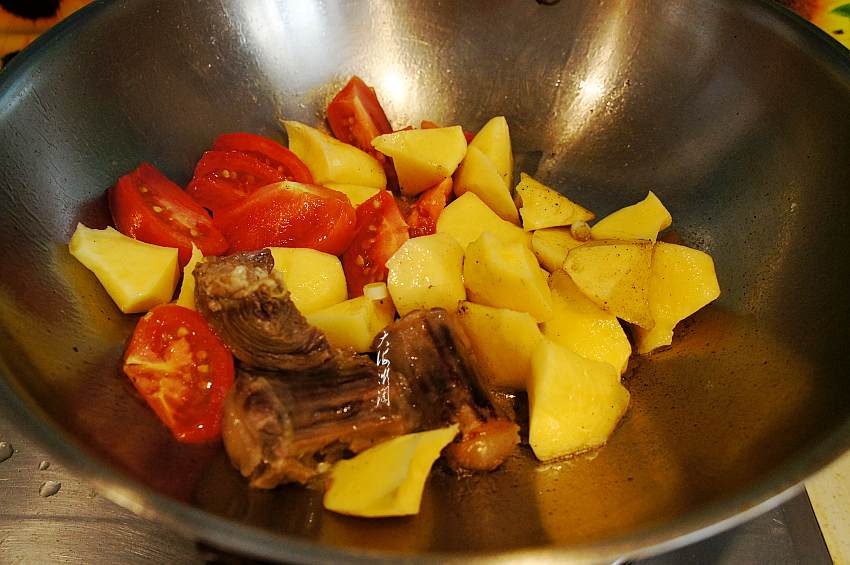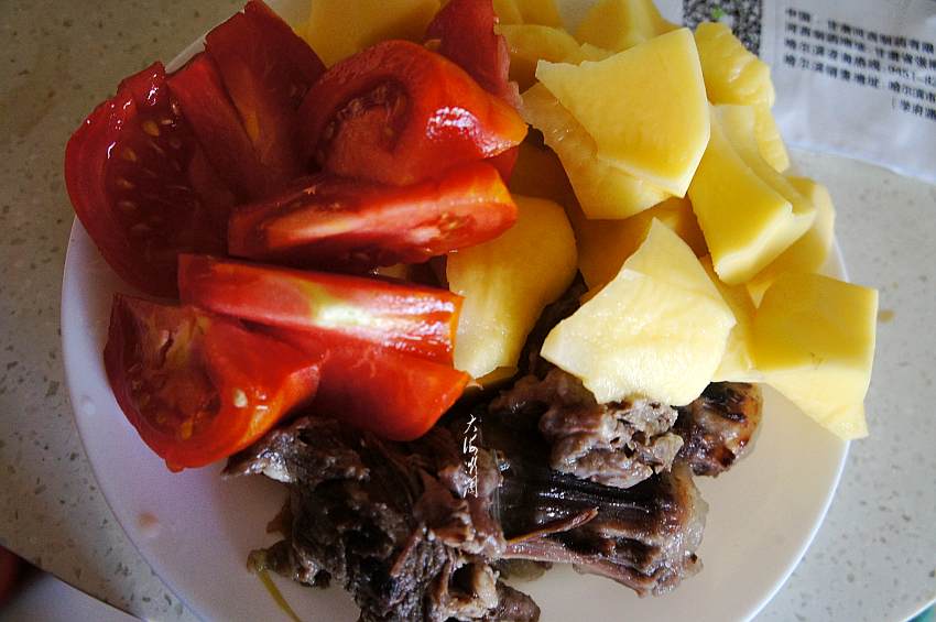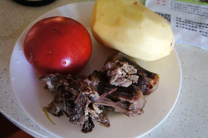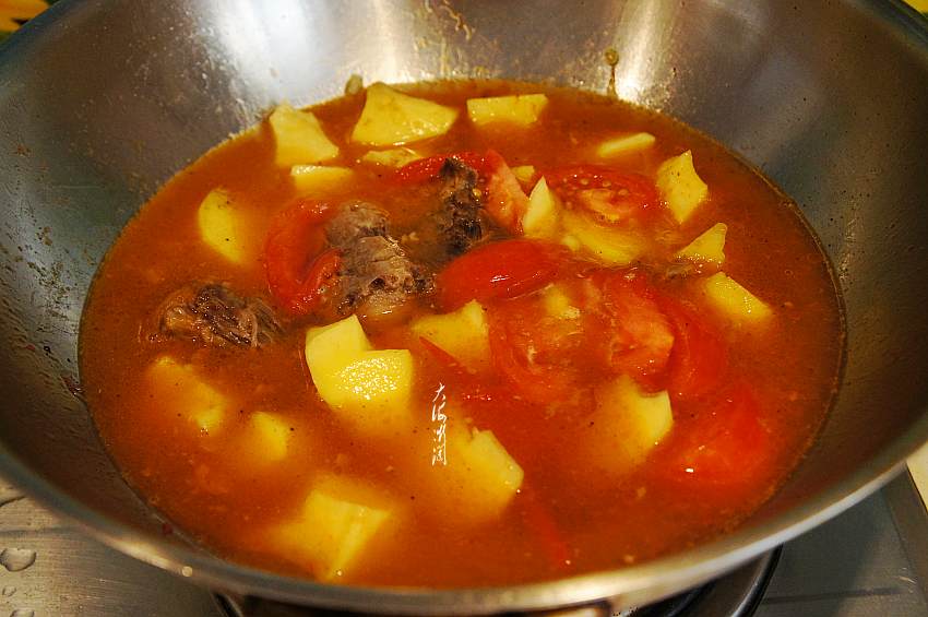做法:1、准备食材:番茄洗净,土豆去皮洗净,牛尾骨是之前用砂锅炖了好久,捞出骨头,将汤汁放在冰箱里冷藏,然后撇去上边凝固的牛油,再用来入菜的;