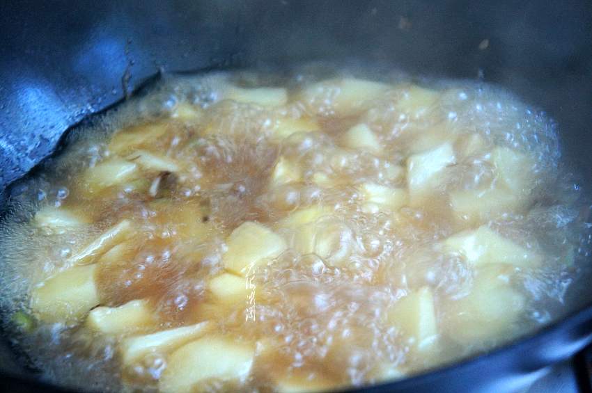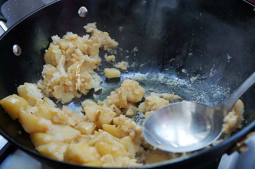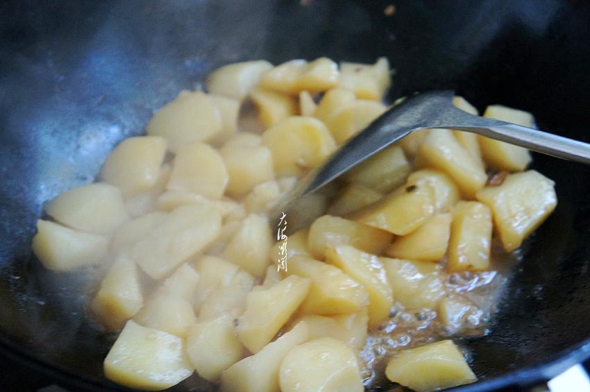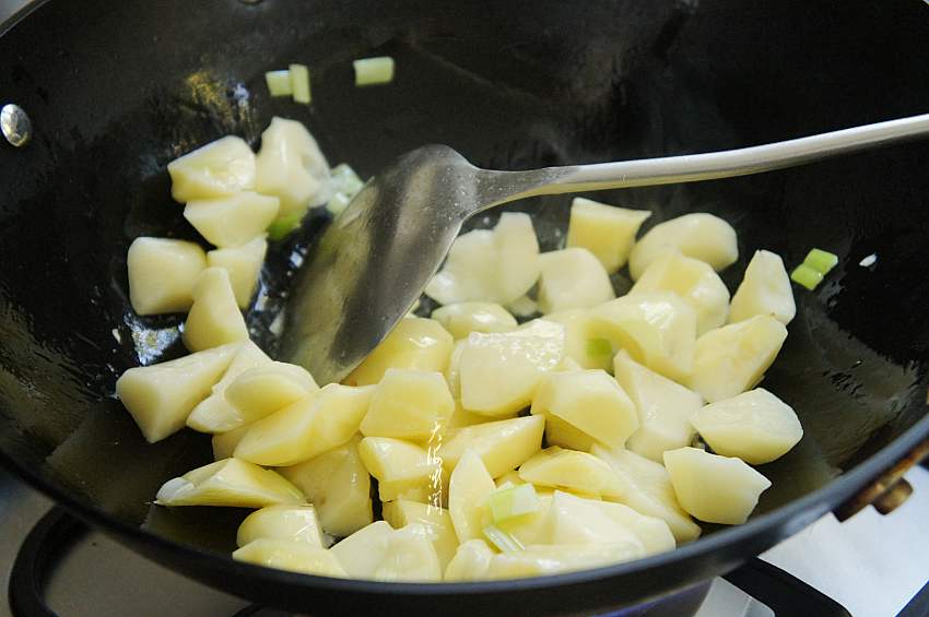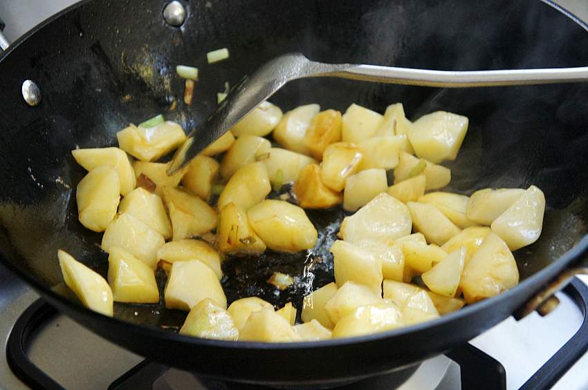 3、炒锅加入适量的油,爆香五香粉和葱花,加入土豆块翻炒;