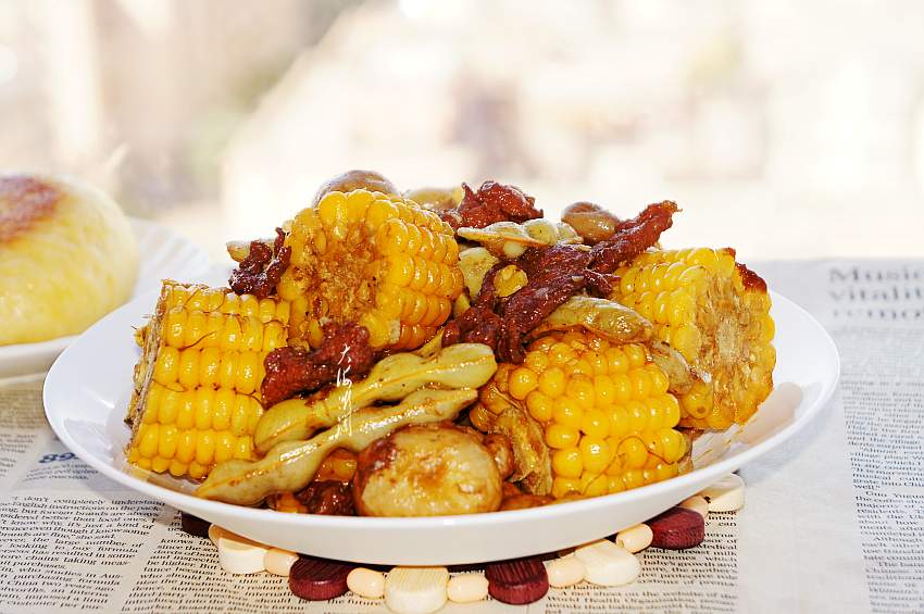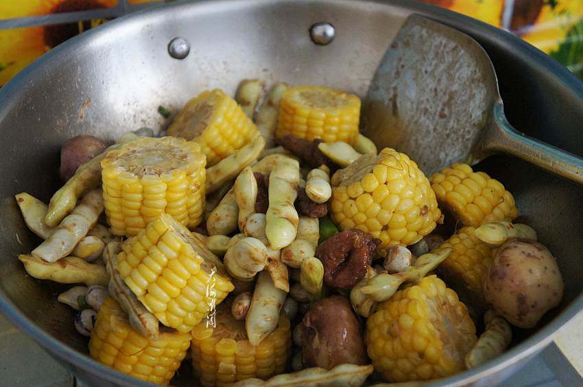 2、玉米可以是生玉米也可以是煮熟的玉米,如果用生的嫩玉米要适量多加一些水,炖的时间相对要长一些,玉米炖熟为好;