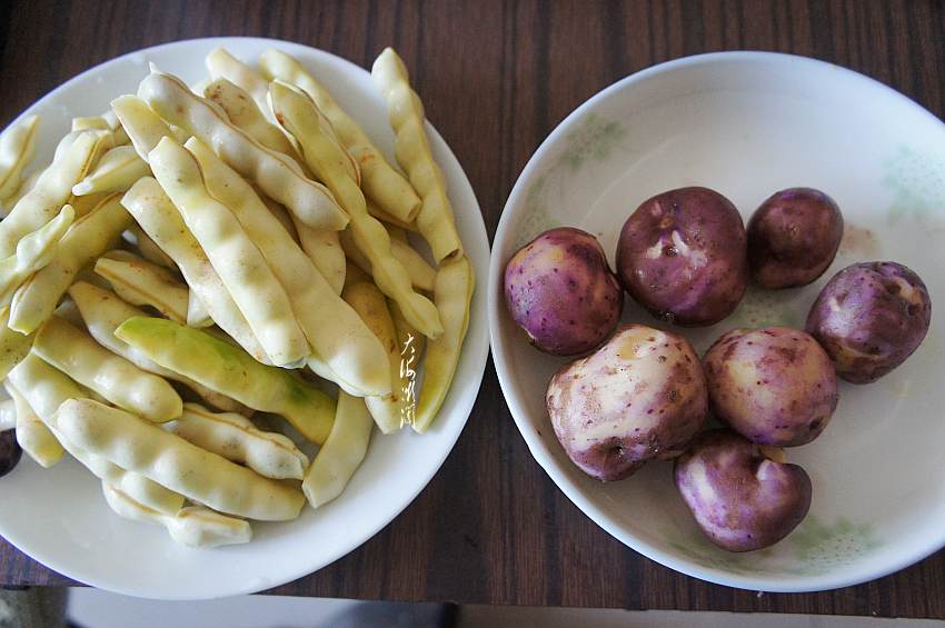 做法:1、豆角掐头去尾洗净。小土豆用刮刀刮掉表皮洗净,这土豆是红土豆,特别的面,但是产量低,北方市场也不多见,是姐姐自己种的红土豆,炖熟了就没有红颜色了;