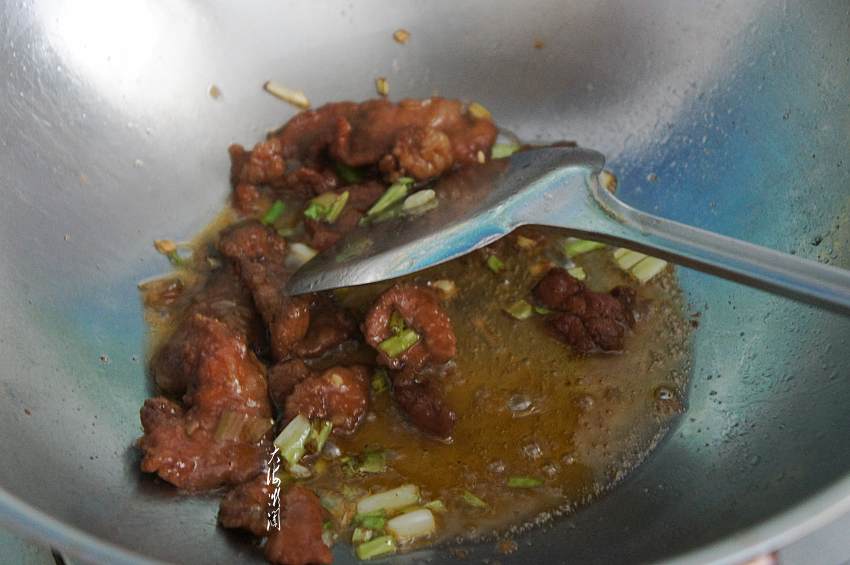3、牛肉切片,用料酒、生抽和淀粉腌制10分钟。炒锅加入适量的油,爆香葱花和五香粉,加入牛肉大火快速翻炒;