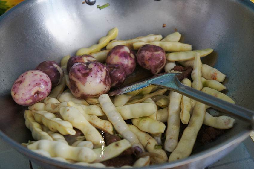 4、加入土豆和豆角翻炒,豆角炒至变软;