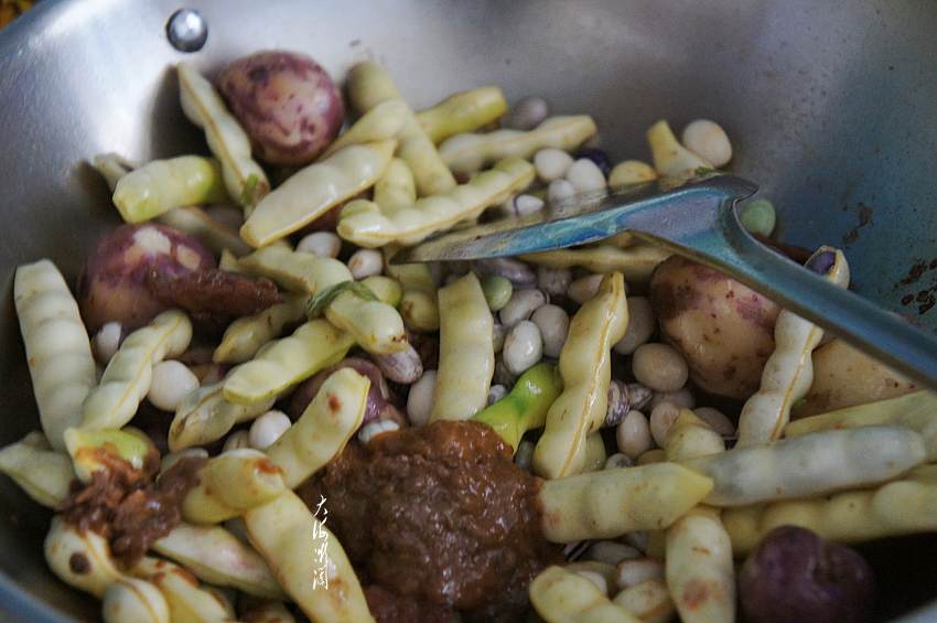 【东北大丰收】所需食材:玉米2只;小土豆7个,豆角适量;牛肉150g;油适量;五香粉适量;葱适量;生抽适量;料酒适量;淀粉适量;自制黄豆酱适量;豆角适量;