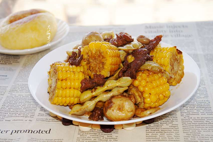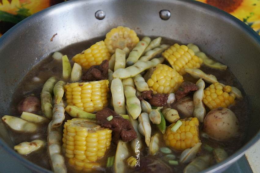 这是一道比较典型的东北农家菜,现在已经是东北的名菜了。北方人喜欢炖菜,尤其是秋天,各种果实成熟,将它们搭配在一起,充满着大丰收的景象,所以这道菜的名字也很好听,【东北大丰收】,展示农民一年辛勤的劳动换来了秋天的丰硕成果,这菜荤素搭配,食材随意,喜欢的食材都可以放在一起炖,因此,它还有一个名字叫乱炖,乱炖一锅出,那叫一个香。我家人都很喜欢这道菜,有滋有味, 玉米的香甜,土豆和豆角香浓软糯的口感,平常都是习惯用排骨来炖,今天这菜主要炖给老人孩子吃,换成牛肉,不但味道好,营养价值更高,还有安中益气,健脾养胃,强骨壮筋的功效。尤其是秋冬时节多食牛肉可暖胃,牛肉也是这个季节的补益佳品。