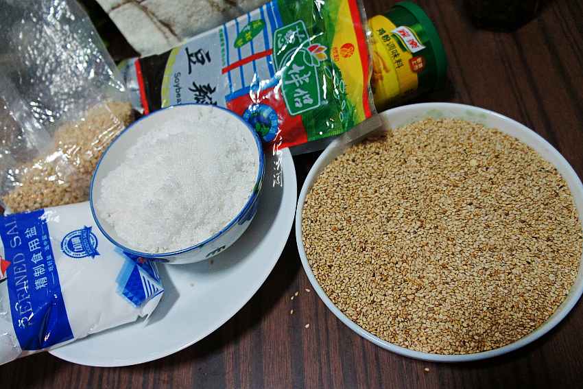 4、备齐所有的配料,芝麻和花生事前炒熟或者烤熟,花生压碎或者打碎;