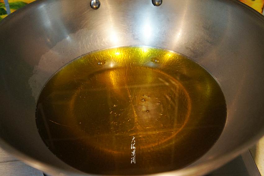 7、炒锅加入油烧开,我用的是外婆小榨菜籽油,这油很香,植物油都可以,没有特别要求;