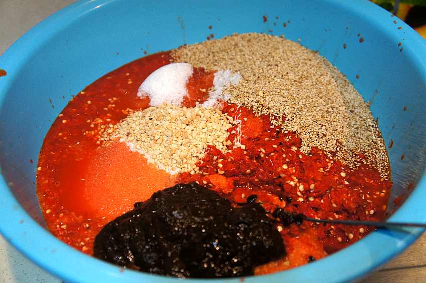 【自制辣椒酱】所需食材:红辣椒5斤;菜籽油1斤;芝麻半斤;盐半斤;白糖半斤;豆瓣酱2袋;味素2两;大蒜1斤;花生碎适量。