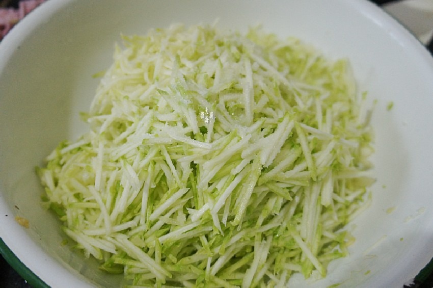 3、西葫芦洗净,去掉瓜瓤,用擦丝器擦成丝,加入适量的盐腌制十分钟,然后攥掉水分备用;