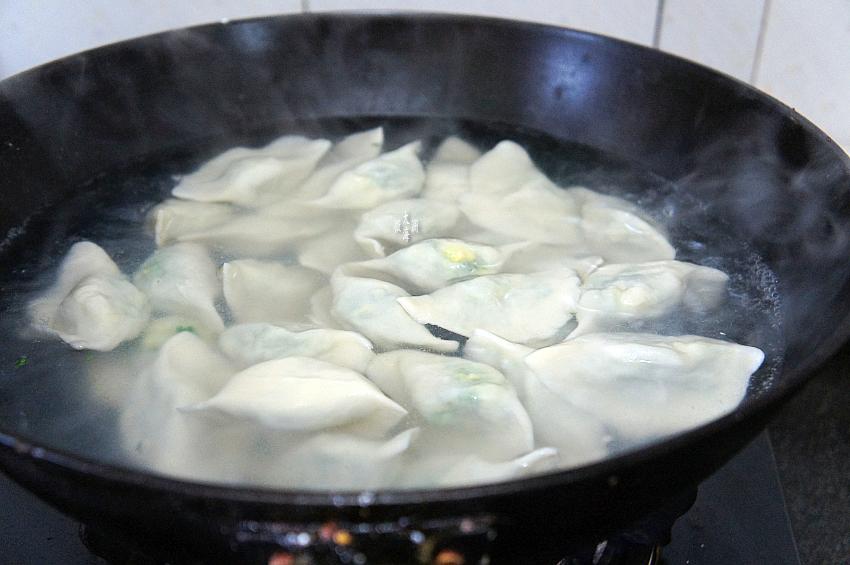 7、煮饺子:锅中加入适量的水,水开下入饺子,煮开浇些冷水,再煮开再浇一次冷水,第三次煮开出锅,饺子煮的恰到好处