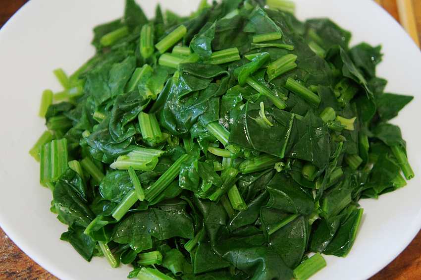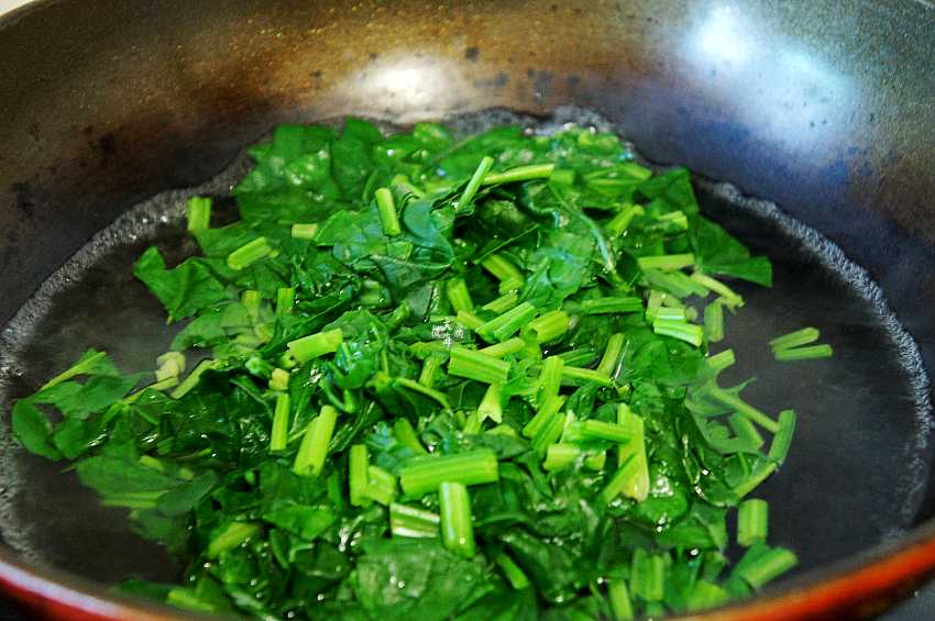 2、锅中烧开水,加几滴油和一小勺盐,下入菠菜焯烫1-2分钟就好,这样做可以去掉菠菜中所含的大部分草酸,这部分草酸溶解在水里之后,再烹调时菠菜就没有涩味了,同时还保留了其它维生素不会被破坏,颜色也更碧绿;