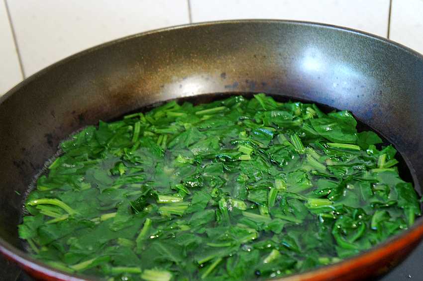 4、锅中加入适量的水,水开下入菠菜段儿;