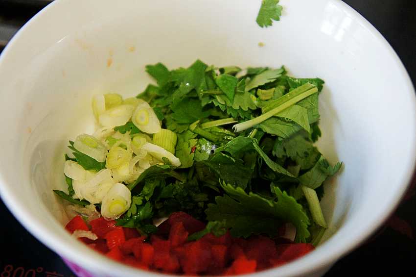 6、葱洗净切碎,香菜择洗干净切碎,红甜椒洗净切碎,主要用来调味调色,增加食欲;
