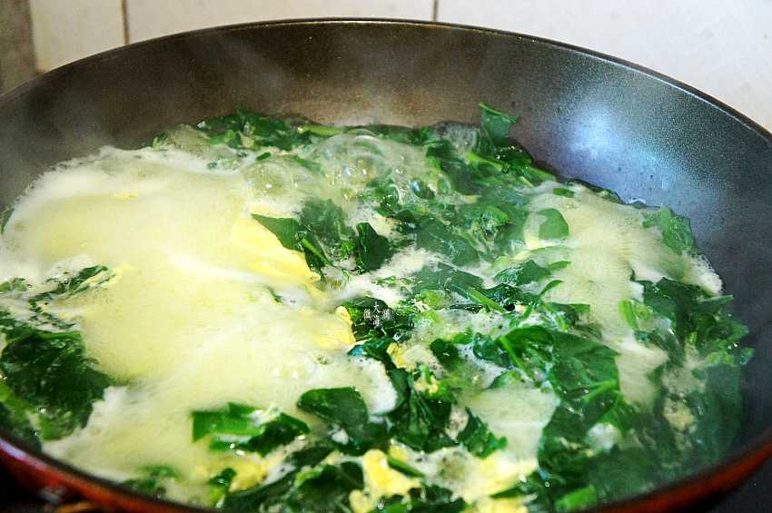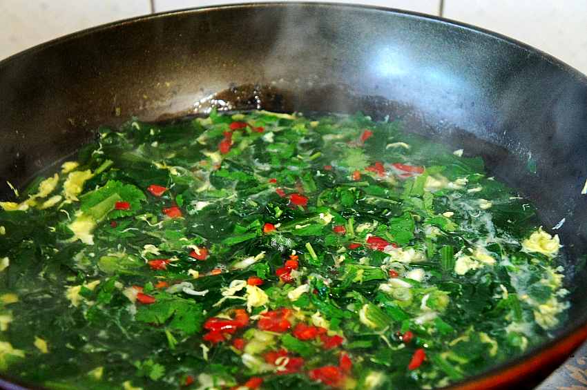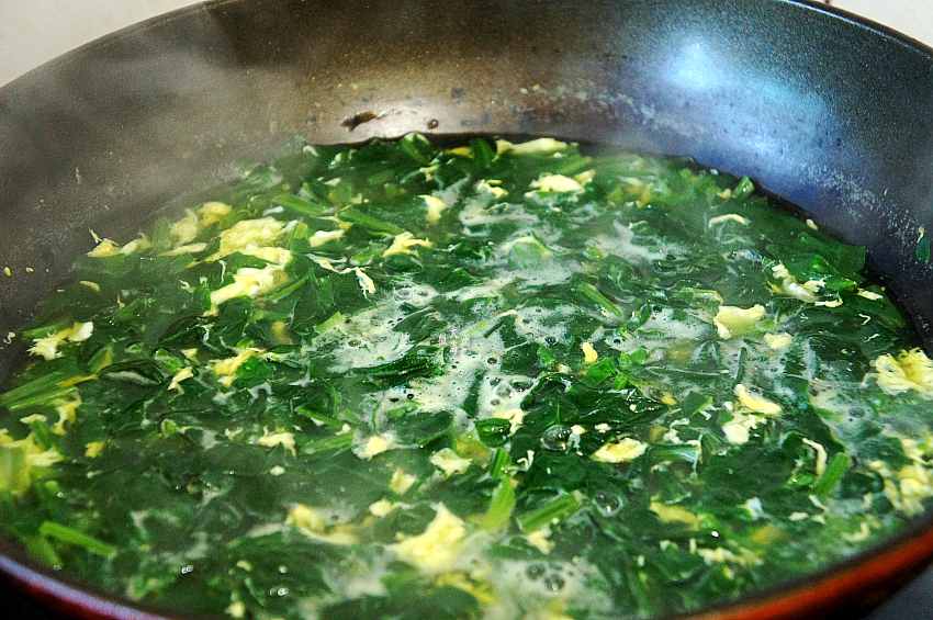 7、鸡蛋打散,菠菜煮开时撒入蛋液熊成蛋花;