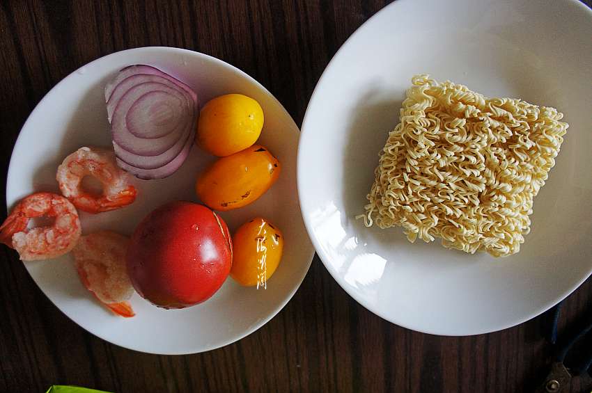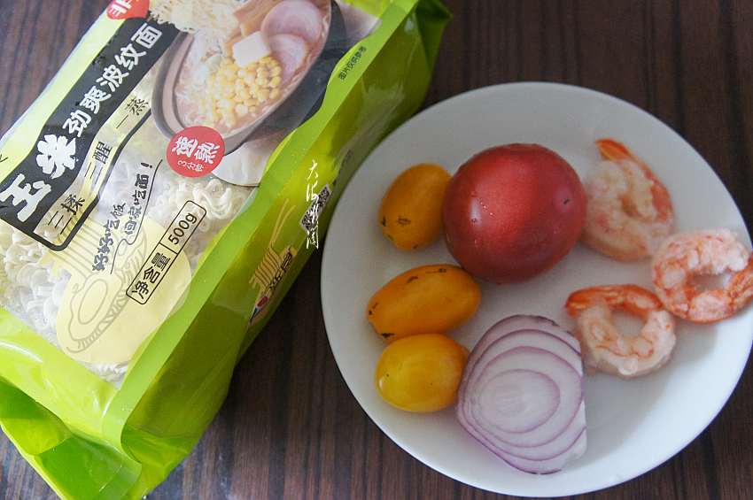 【番茄大虾玉米波纹面】所需食材:新良玉米劲爽波纹面2片;红番茄1个;黄番茄3个;凤尾虾3只;油适量;盐适量;葱适量;五香粉适量;糖适量;洋葱适量。