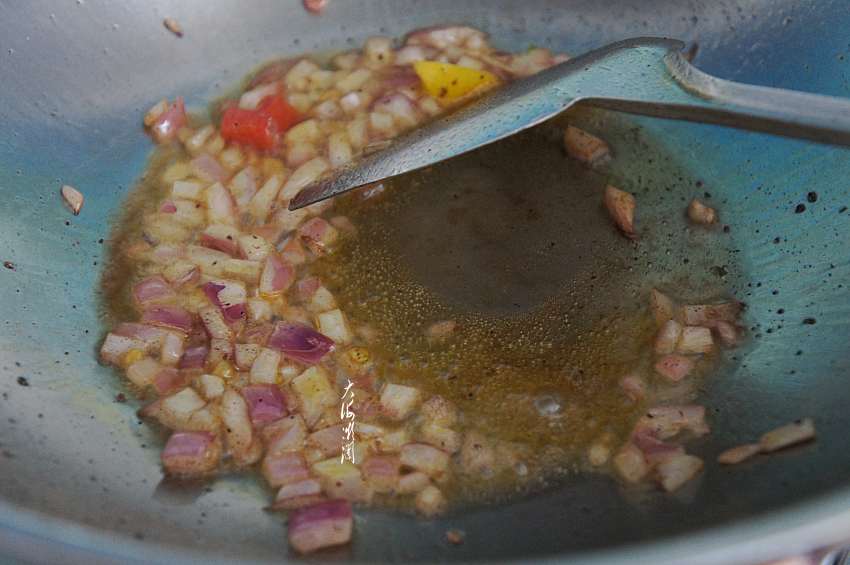 6、炒锅加入适量的油;爆香五香粉和洋葱碎;