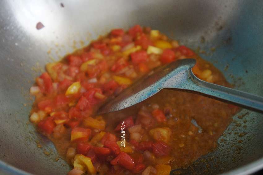 7、加入番茄丁翻炒,加少许水炒至浓稠;