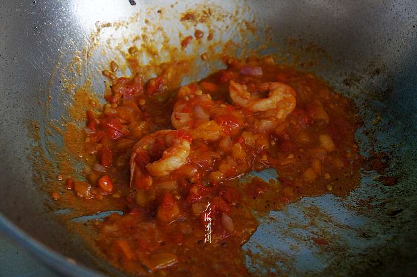 8、加入凤尾虾翻炒至颜色变红,加入盐、糖调味;