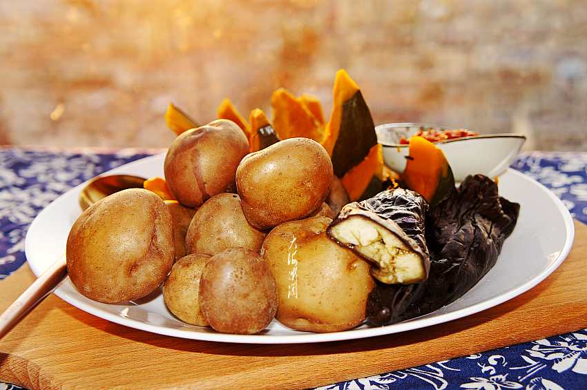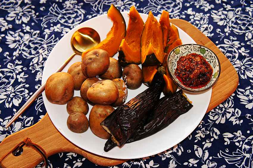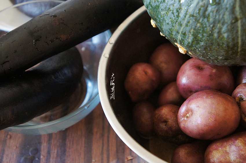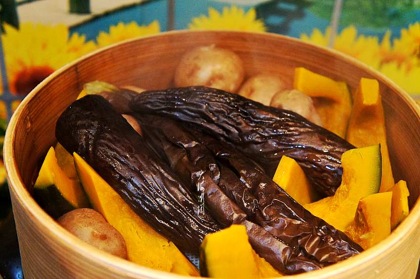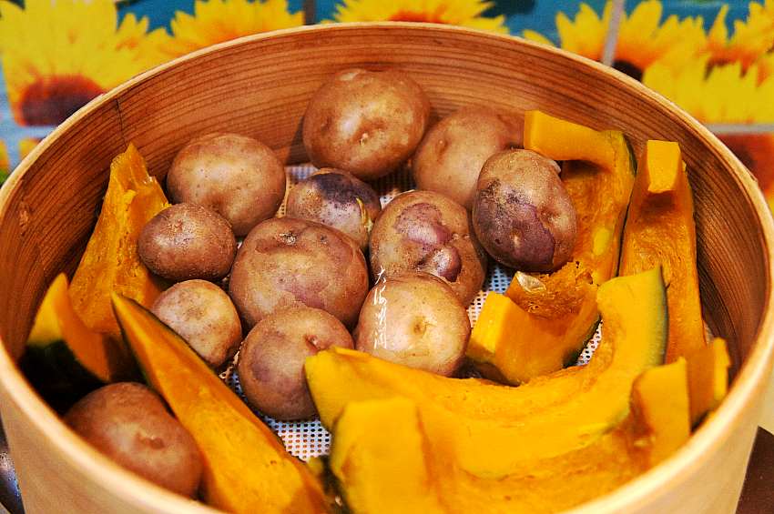 6、10分钟左右打开锅,先取出茄子,茄子蒸过了就不好吃啦。此时如果土豆和倭瓜还没蒸熟,继续蒸5分钟左右;