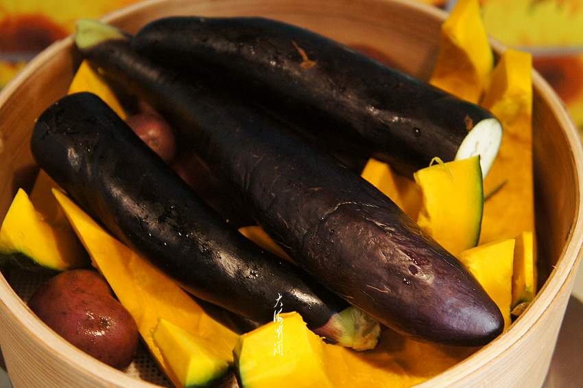 4、茄子洗净,长茄子切断,所有食材放入蒸屉内;