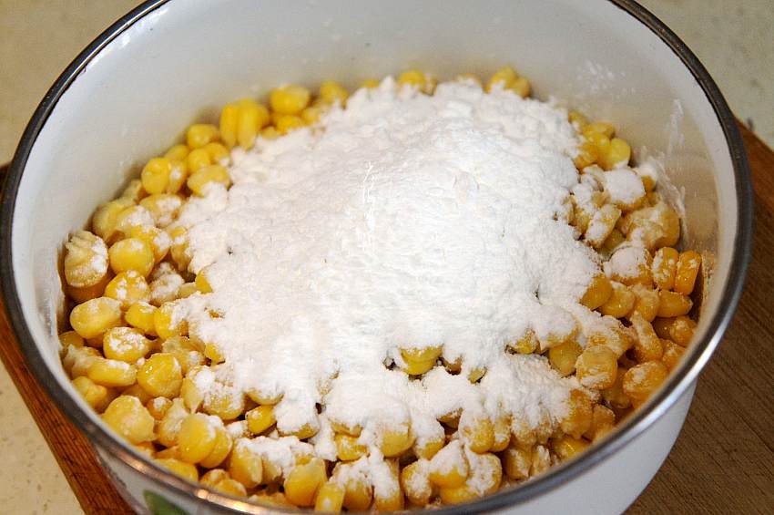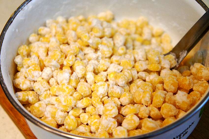 5、拌匀,让每一颗玉米粒都沾满淀粉,加淀粉时要留点余量,注意观察,因玉米的大小不同,玉米粒多少也不同,如果感觉还有没沾到淀粉的就再加一些淀粉,饱和了就不要加了;