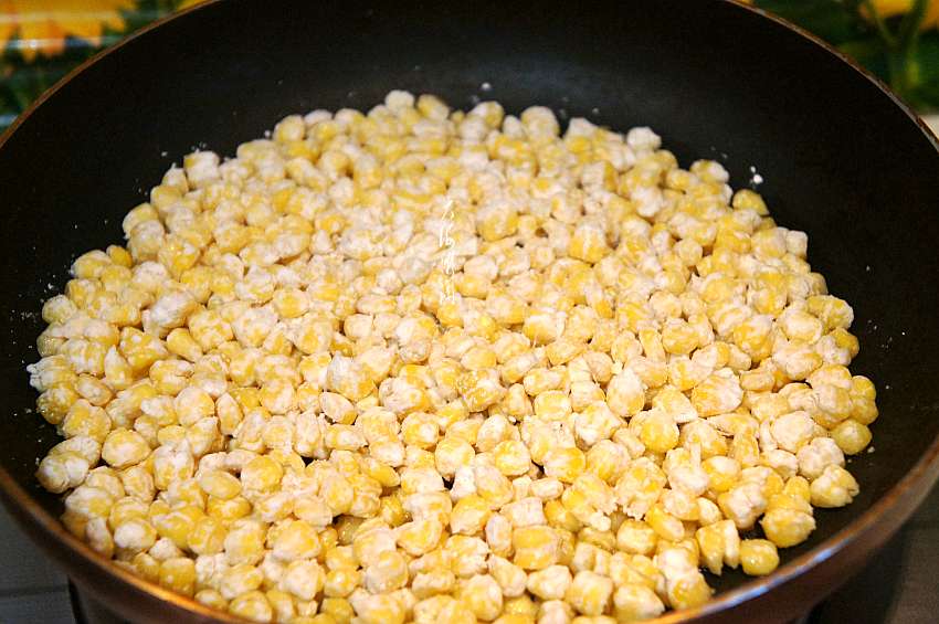 7、正常这一步要倒入刚刚倒出的熟油,没过玉米粒,转中火升高温度,炸3分钟到玉米粒金黄酥脆。但是明显的看到锅边的玉米粒没有粘连好,可能与我选择的锅也有关系,平底锅还是太大了,幸亏没成形,不然还没有合适的盘子装呢。以前做都是用炒锅,做的少容易操作,一般就做2只玉米的玉米粒,今天做的有点多,翻面看看,果然碎了;