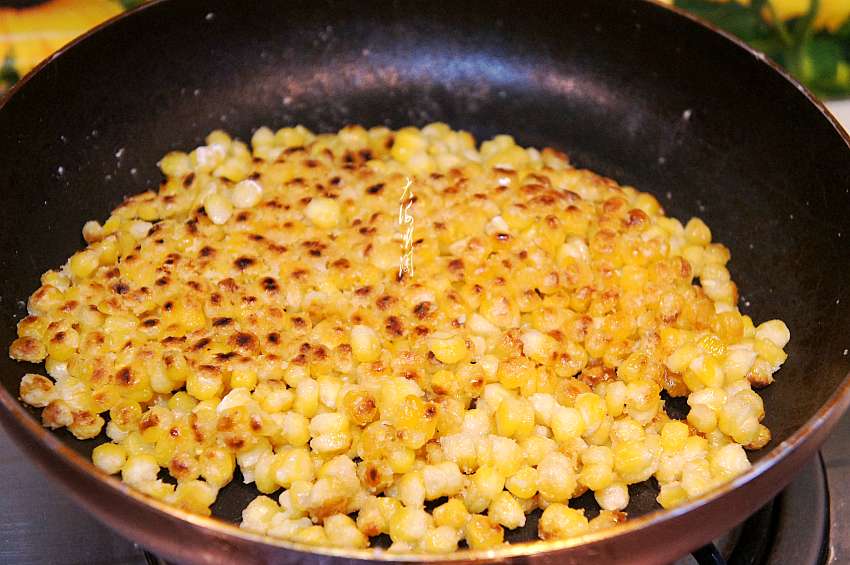 6、锅中加入半碗油,烧熟后倒出,锅中留少量的油,转小火,倒入拌匀的玉米粒,轻轻压平,煎3-5分钟,玉米粒粘在一起形成块状;