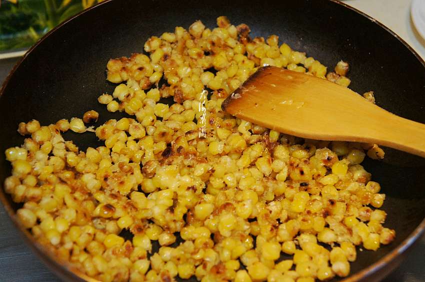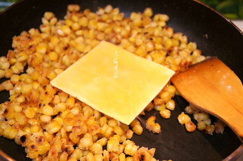 8、直接将其用木铲弄碎,加入一些油炒至玉米粒酥脆,加入1-2片奶烙翻炒;