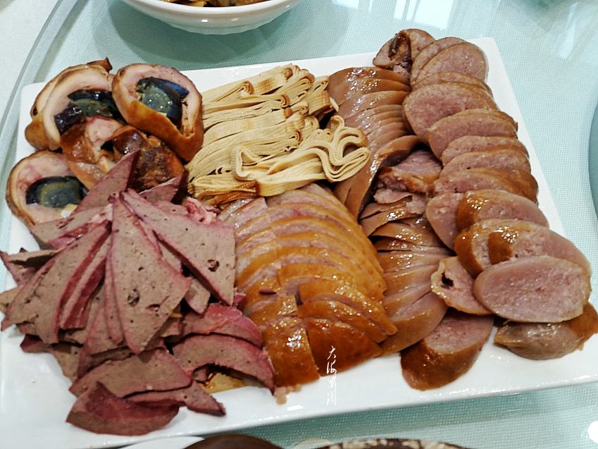 【大盘冷拼】这一大盘很丰富,包括粉肠,饭店自家做的粉肠味道很棒。自制的松仁小肚,味道也不错,还有盐水肝,可直接吃也可蘸蒜泥吃,非常好吃。松花鸡腿和干豆腐卷,我比较喜欢松花鸡腿,干豆腐卷味道也不错。