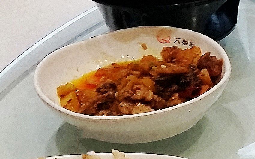 【屯子蒸肉】这道菜名字很特别,虽然没拍好也要展示给大家,有点梅菜扣肉的味道,不过肉片底下可不是梅菜,而是蘑菇,屯子蘑菇多,是不是因此而得名就不得而知了,肉肉香而不腻,超好吃,蘑菇就是那种榛蘑,特别有味道,非常好吃的一道菜,菜名也是吃过不忘。