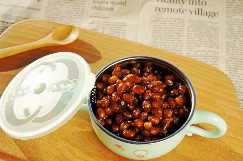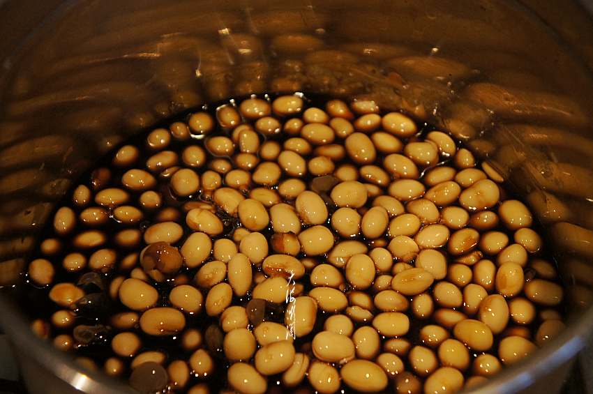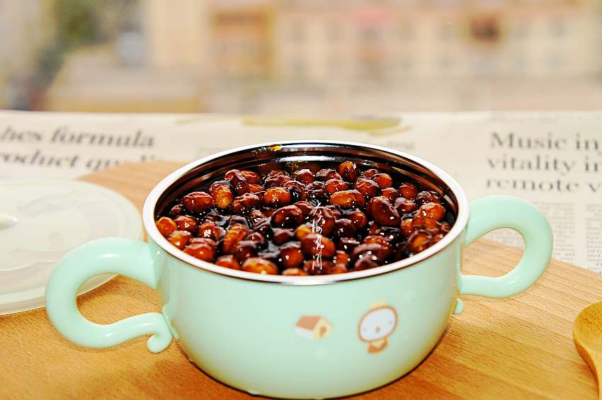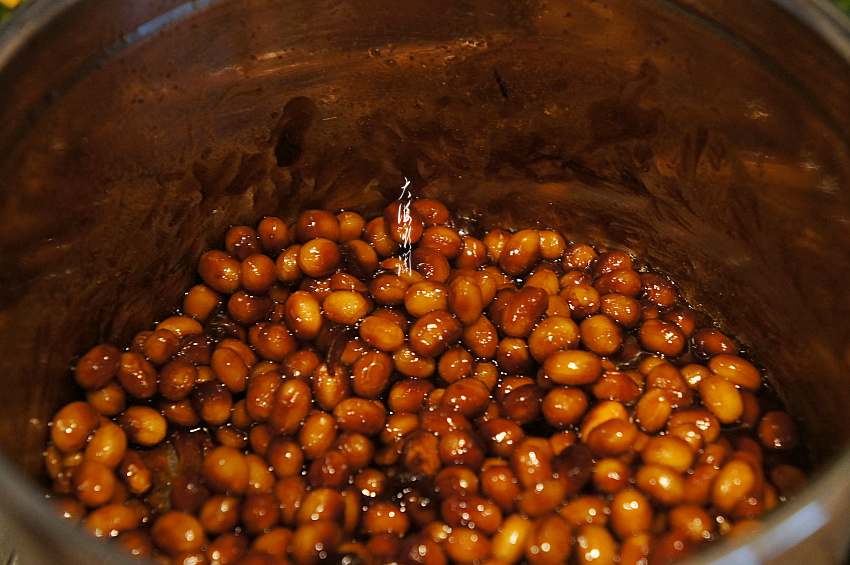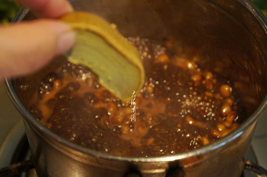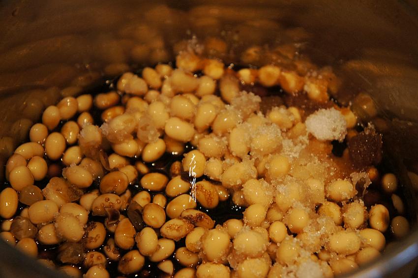 5、下入煮好的黄豆和白糖;