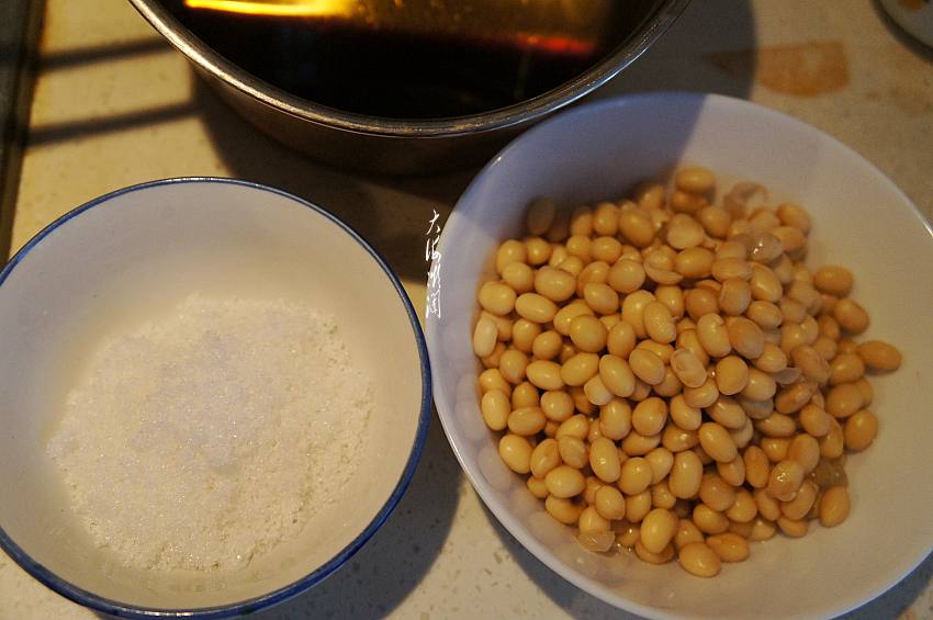 3、煮好的黄豆捞出备用,准备好其他食材;