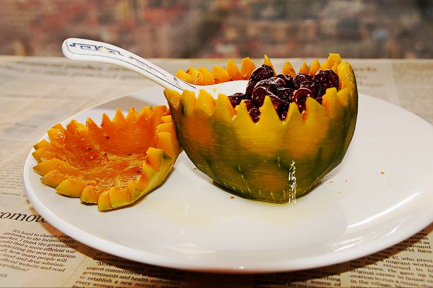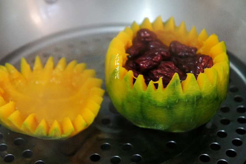 【红枣蒸倭瓜】所需食材:金丝枣50g;小倭瓜1个;蜂蜜1汤匙;桂花酱适量。