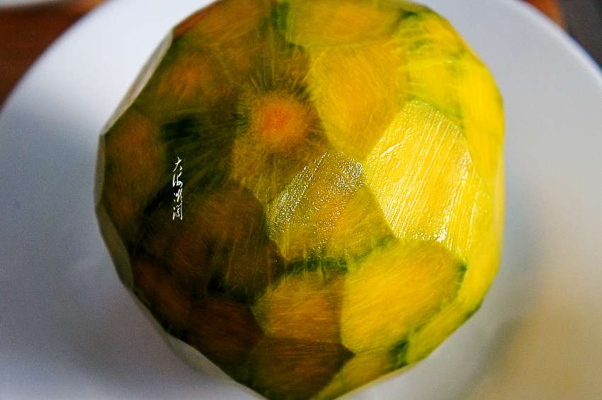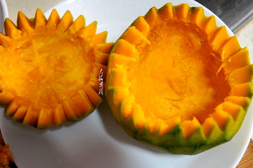 2、倭瓜去皮洗净,秋天的老皮有点硬,为了好吃也好看,我去掉了这层老皮,可以不去皮,吃的时候将外层薄膜去掉就成;