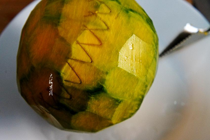 3、选好位置用边上这种水果刀切出造型,上半部分小一点做盖子;