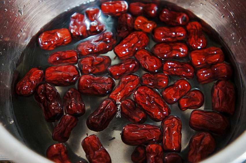 5、红枣最好提前浸泡一夜,我浸泡的时间短,没有完全泡开,红枣洗净;