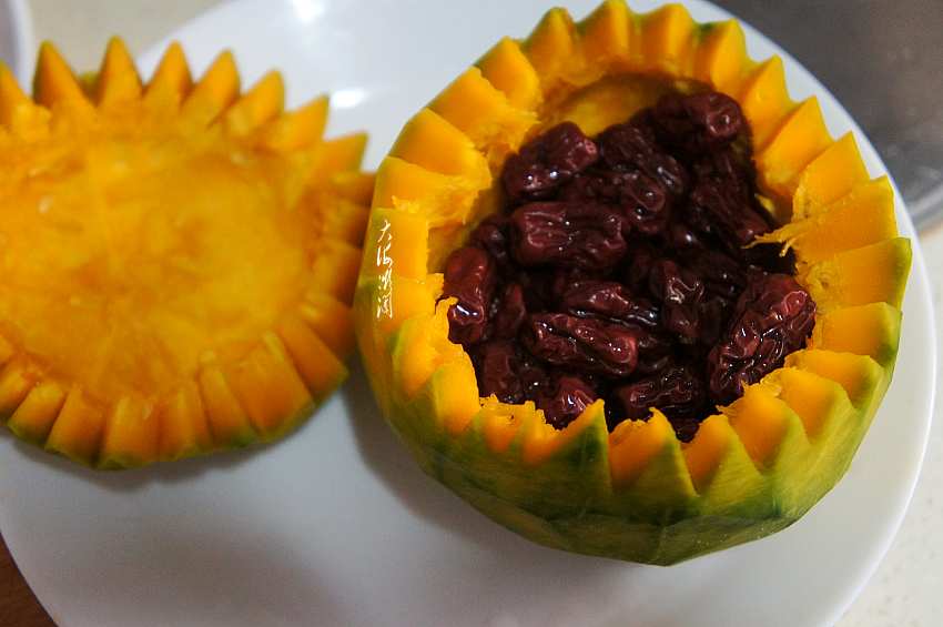 这倭瓜是哥哥自家种的,纯绿色食材,而且保质期长,放很长时间都木有变化,有的品种放的时间越长倭瓜越面,越好吃。我家人都喜欢吃蒸倭瓜,和土豆、胡萝卜、茄子等一起蒸,在炸个鸡蛋酱特别好吃,想想都流口水。今天分享的是另一吃法,甜口,搭配红枣一起蒸,营养更丰富,调上甜桂花,甜甜糯糯的,充满桂花的香气。窝瓜有不可忽视的食疗作用,富含锌,入脾胃二经,可润肺益气,保护胃粘膜,帮助消化,消炎止痛,化痰排脓,驱虫解毒,降糖止渴,并有利尿、美容等作用,糖尿病人吃它是有好处的。而红枣蒸熟了吃更容易消化,营养也不会流失。中医认为,枣有调养脏器、滋补气血、壮阳生津的功效,多吃蒸枣还可以起到预防哮喘的作用。